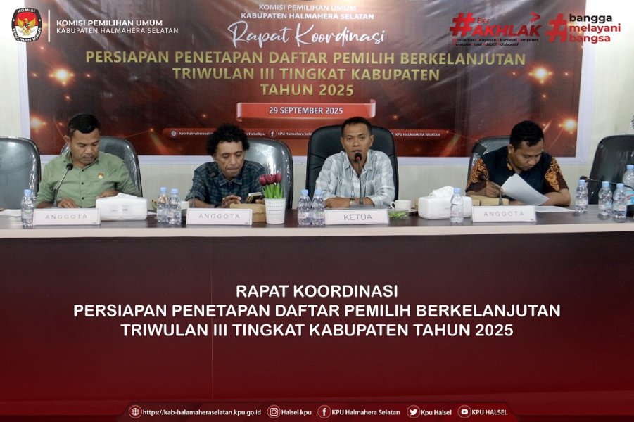 #TemanPemilih, Senin (29/09/25) KPU Kabupaten Halmahera Selatan melaksanakan Rapat Koordinasi Pemutakhiran Data Pemilih Berkelanjutan bersama para stakeholder, di antaranya Bawaslu, Disdukcapil, TNI, dan Polri. Kegiatan ini berlangsung di Aula Husni Kamil Malik, KPU Kabupaten Halmahera Selatan, dan dipimpin langsung oleh Ketua KPU Kabupaten Halmahera Selatan, Bapak Tabrid S. Thalib, beserta jajaran komisioner. Rapat tersebut dihadiri oleh Ketua Bawaslu Kabupaten Halmahera Selatan Bapak Rais Kahar, Anggota Bawaslu Kabupaten Halmahera Selatan Bapak Hans Wilam, Pasiter Kodim 1509/Labuha Bapak Lukito, Kasat Intel Polres Halmahera Selatan Bapak Ikmal Abjan, serta Kabid PIAK Dukcapil Bapak M. Kamarullah. Dalam arahannya, Ketua KPU Kabupaten Halmahera Selatan menyampaikan bahwa pemutakhiran data berkelanjutan ini akan dibandingkan dengan data Triwulan II, sementara saat ini telah memasuki Triwulan III. Tujuannya adalah untuk menyamakan persepsi dengan stakeholder, termasuk memperoleh informasi dari TNI dan Polri mengenai anggota yang telah purna tugas agar dapat dimasukkan ke dalam daftar pemilih baru, serta mengeluarkan anggota TNI dan Polri aktif yang baru masuk dari daftar pemilih tetap. Dengan demikian, KPU Halmahera Selatan dapat memperoleh data daftar pemilih berkelanjutan yang lebih akurat. Berdasarkan hasil pencocokan dan penelitian, pada Triwulan II tercatat sebanyak 179.991 daftar pemilih berkelanjutan. Sementara pada Triwulan III meningkat menjadi 186.602 pemilih (95.699 laki-laki dan 90.903 perempuan) yang tersebar di 249 desa/kelurahan pada Kabupaten Halmahera Selatan. Dalam rapat koordinasi tersebut, Ketua KPU Kabupaten Halmahera Selatan juga menegaskan akan menindaklanjuti kekurangan data yang disampaikan oleh pihak Bawaslu. #KPUMelayani #KPUHalsel #KPURI LINK FOTO ....