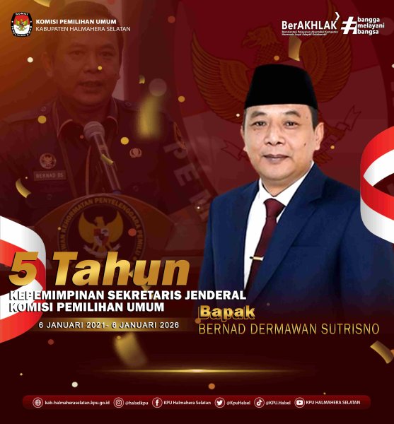 KPU Kabupaten Halmahera Selatan Mengucapkan Selamat Atas 5 Tahun Kepemimpinan Sekretaris Jenderal KPU RI Bapak Bernard Dermawan Sutrisno, 6 Januari 2021 s.d 6 Januari 2026 #KPUMelayani #KPUHALSEL #KPURI ....
