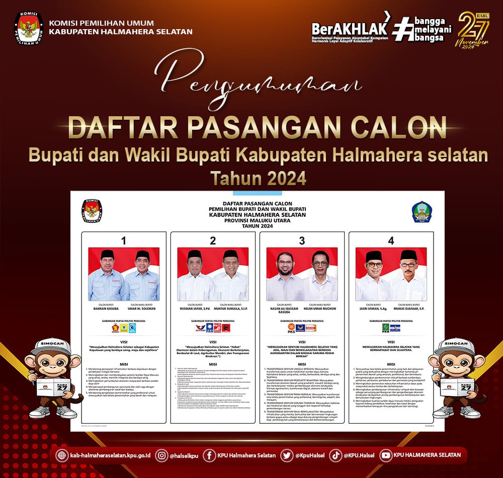 DAFTAR PASANGAN CALON BUPATI DAN WAKIL BUPATI KABUPATEN HALMAHERA SELATAN TAHUN 2024 Jumat, 04 Oktober 2024 21:54 687 PENGUMUMAN DAFTAR PASANGAN CALON BUPATI DAN WAKIL BUPATI KABUPATEN HALMAHERA SELATAN TAHUN 2024 Baca Selengkapnya