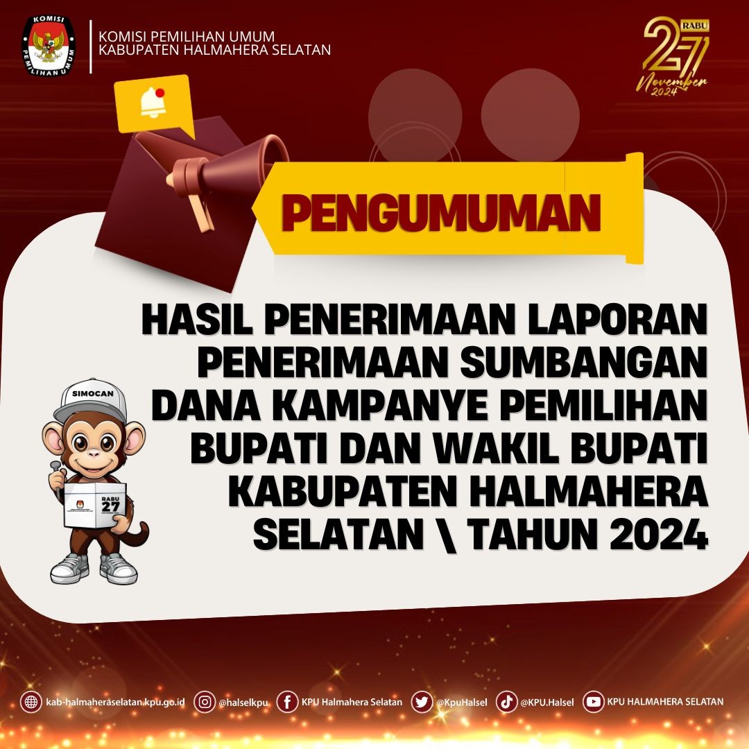 PENGUMUMAN LAPORAN PENERIMAAN SUMBANGAN DANA KAMPANYE PEMILIHAN BUPATI DAN WAKIL BUPATI KABUPATEN HALMAHERA SELATAN Sabtu, 26 Oktober 2024 08:24 498 PENGUMUMAN LAPORAN PENERIMAAN SUMBANGAN DANA KAMPANYE PEMILIHAN BUPATI DAN WAKIL BUPATI KABUPATEN HALMAHERA SELATAN Baca Selengkapnya