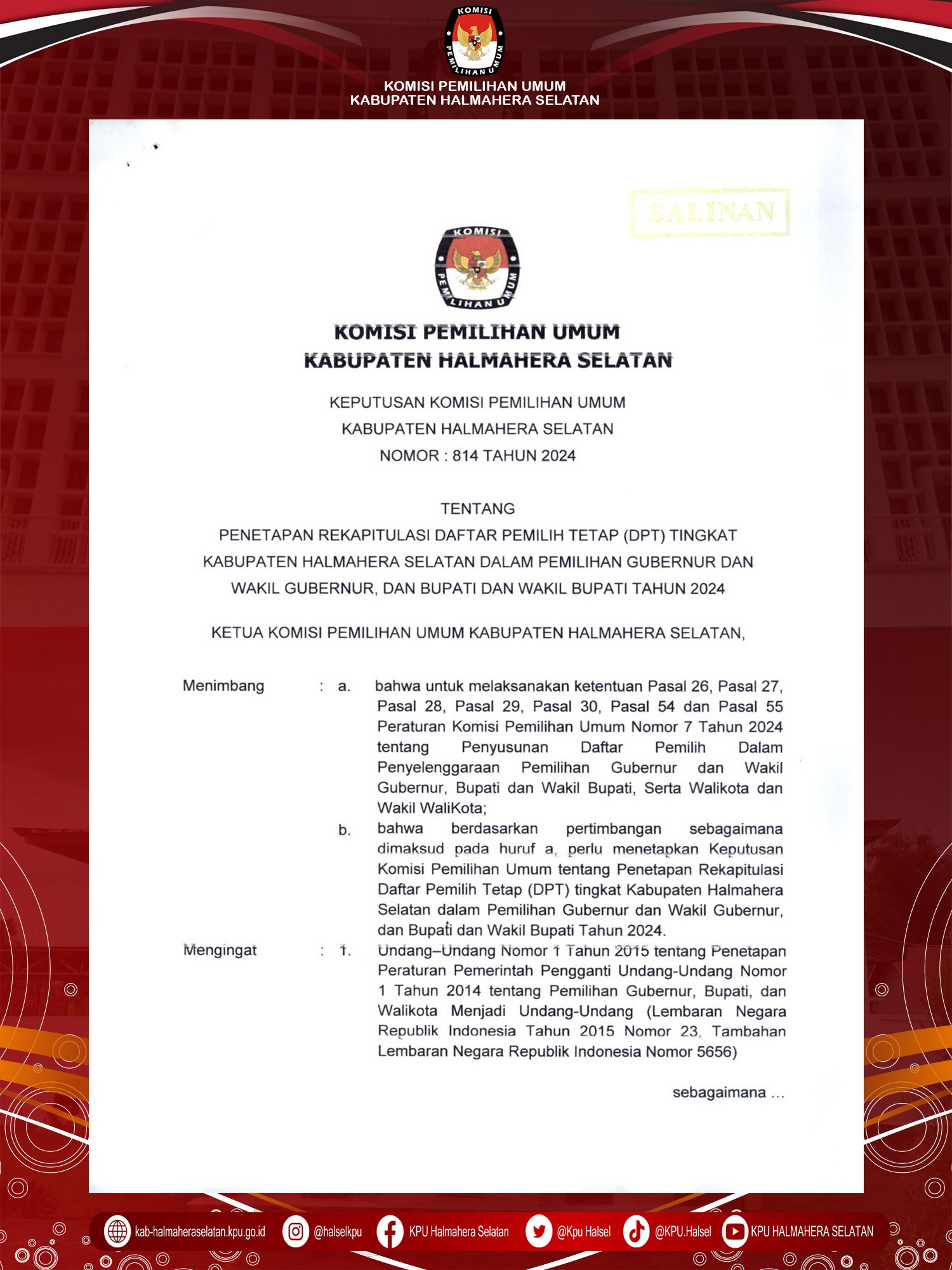 PENETAPAN REKAPITULASI DAFTAR PEMILIH TETAP (DPT)TINGKAT KABUPATEN HALMAHERA SELATAN DALAM PEMILIHAN GUBERNUR DAN WAKIL GUBERNUR KABUPATEN HALMAHERA SELATAN Senin, 02 Desember 2024 12:43 484 PENETAPAN DAFTAR PEMILIH TETAP (DPT) Bagikan: Telah dilihat 484 kali