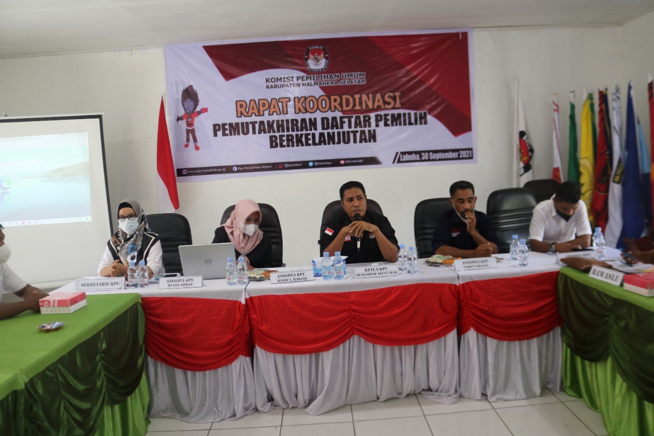 Senin, 30 Agustus 2021 bertempat di ruang rapat lantai dua Komisi Pemilihan Umum Kabupaten Halmahera selatan, dilaksanakan Pleno Rekapitulasi data Pemilih Berkelanjutan periode Agustus 2021 yang dihadiri oleh ketua dan anggota, Plt Sekertaris serta para kasubag KPU Halmahera Selatan. Pada pemutakhiran data pemilih berkelanjutan di bulan Agustus ini belum ada laporan dari masyarakat tentang pemilih yang baru perekaman, pemilih pensiunan dari TNI/Polri, maupun pemilih TMS (meninggal, pindah domisili, dan menjadi anggota TNI/Polri). Selain itu KPU Halmahera Selatan juga tidak mendapat data pemilih yang baru melakukan perekaman, pemilih Pindah, dan Pemilih meninggal dari Pemerinta Halmahera Selatan sesuai surat dengan nomor 470/433/2021 tentang Pemberitahuan dari Dinas kependudukan dan Catatan Sipil. Olehnya itu Rekapitulasi data Pemilih Berkelanjutan masih berjumlah yang sama yakni laki-laki 78.828 (Tujuh Puluh Delapan Ribu Delapan Ratus Dua Puluh Delapan ) dan perempuan 75.716 (Tujuh Puluh Lima Ribu Tujuh Ratus Enam Belas), Total 154.544 (Seratus Lima Puluh Empat Ribu Lima Ratus Empat Puluh Empat). KPU Halmahera Selatan berharap adanya partisipasi Pemerintah dan masyarakat Halmahera Selatan dalam Pemutakhiran Data Pemilih Berkelanjutan ini. Selain masyarakat, Pemerintah Desa juga diharapkan dapat melaporkan ke KPU Halmahera Selatan jika ada warganya yang meninggal, pindah keluar dari desa atau masuk ke desa, masyarakat yang baru menjadi anggota TNI/Polisi, atau ada anggota TNI/Polisi pensiunan, dengan membawa identitas pelapor juga yang dilaporkan, berupa KTP, KK, serta surat keterangan kematian dari Desa atau akte kematian bagi pemilih yang meninggal. ( Rusna )30 Agustus 2021 bertempat di rua rapat lantai dua Komisi Pemilihan Umum Kabupaten Halmahera selatan, dilaksanakan Pleno Rekapitulasi data Pemilih Berkelanjutan periode Agustus 2021 yang dihadiri oleh ketua dan anggota, Plt Sekertaris serta para kasubag KPU Halmaher Selatan.