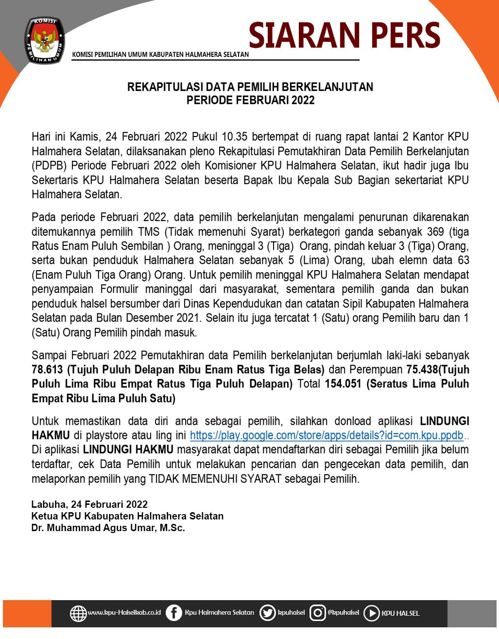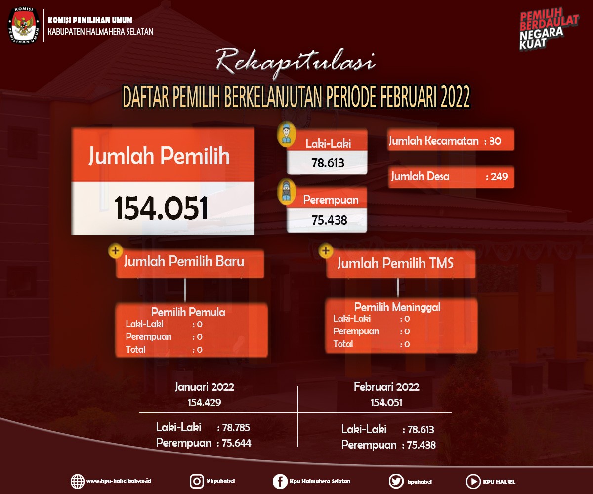 Siaran Pers Pemutakhiran Data Pemilih Berkelanjutan (PDPB) Bulan Februari Tahun 2022 Rabu, 25 Mei 2022 20:22 358 Siaran Pers Pemutakhiran Data Pemilih Berkelanjutan (PDPB) Bulan Februari Tahun 2022 Baca Selengkapnya