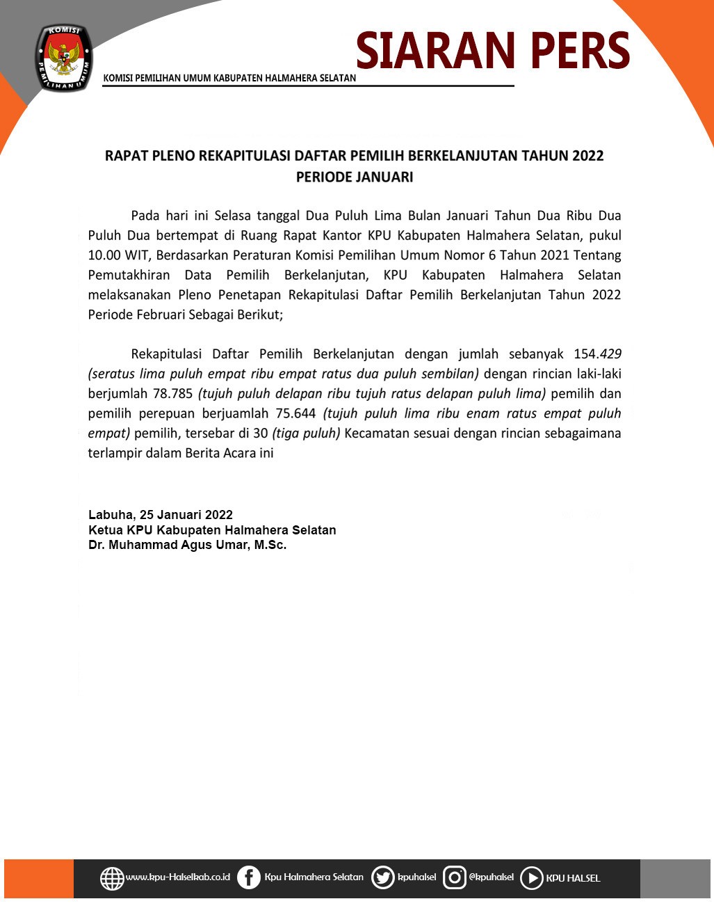 Siaran Pers Pemutakhiran Data Pemilih Berkelanjutan (PDPB) Bulan Januari Tahun 2022 Rabu, 25 Mei 2022 20:22 363 Siaran Pers Pemutakhiran Data Pemilih Berkelanjutan (PDPB) Bulan Januari Tahun 2022 Baca Selengkapnya