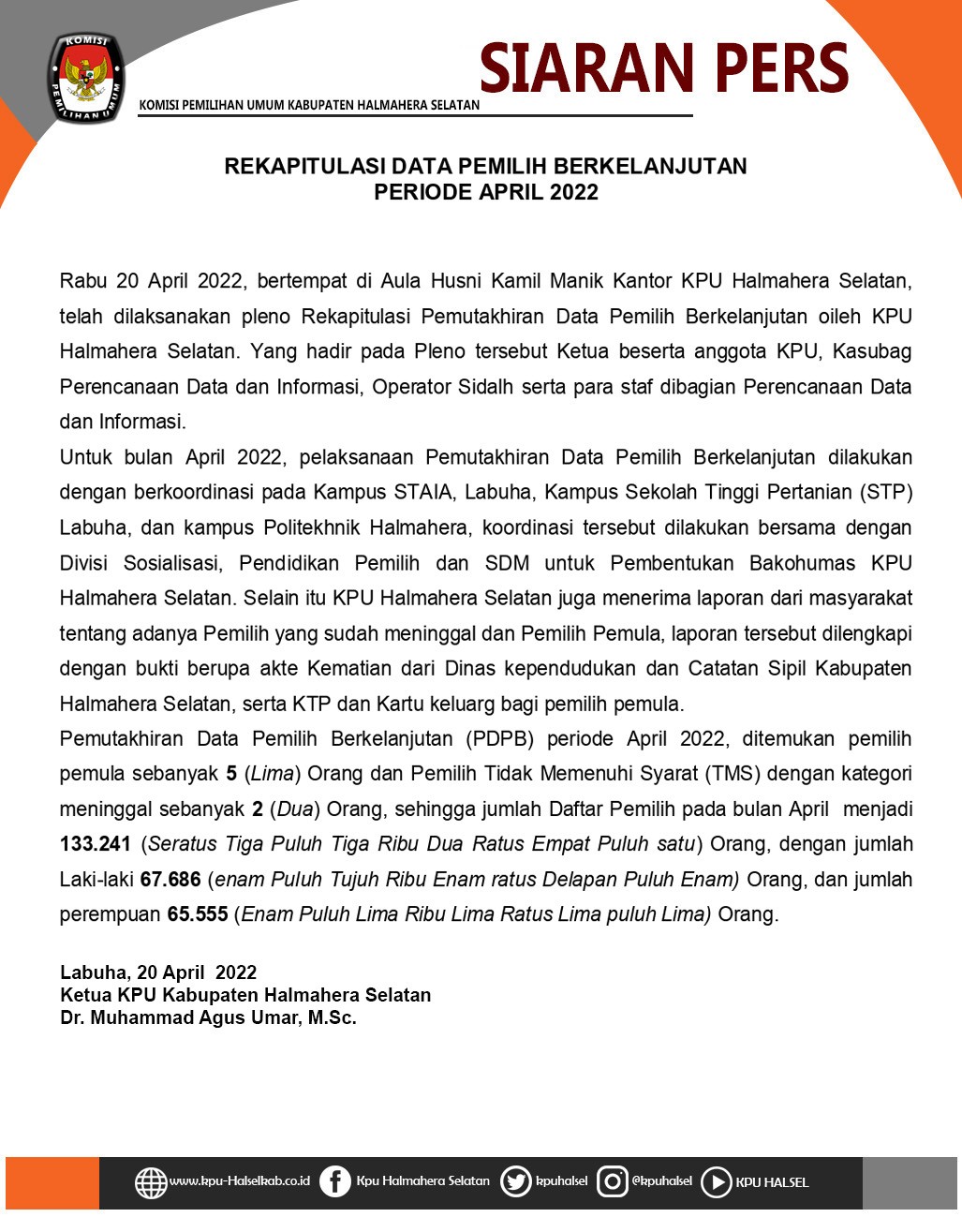 Siaran Pers Pemutakhiran Data Pemilih Berkelanjutan (PDPB) Bulan April Tahun 2022 Rabu, 25 Mei 2022 20:22 353 Siaran Pers Pemutakhiran Data Pemilih Berkelanjutan (PDPB) Bulan April Tahun 2022 Baca Selengkapnya