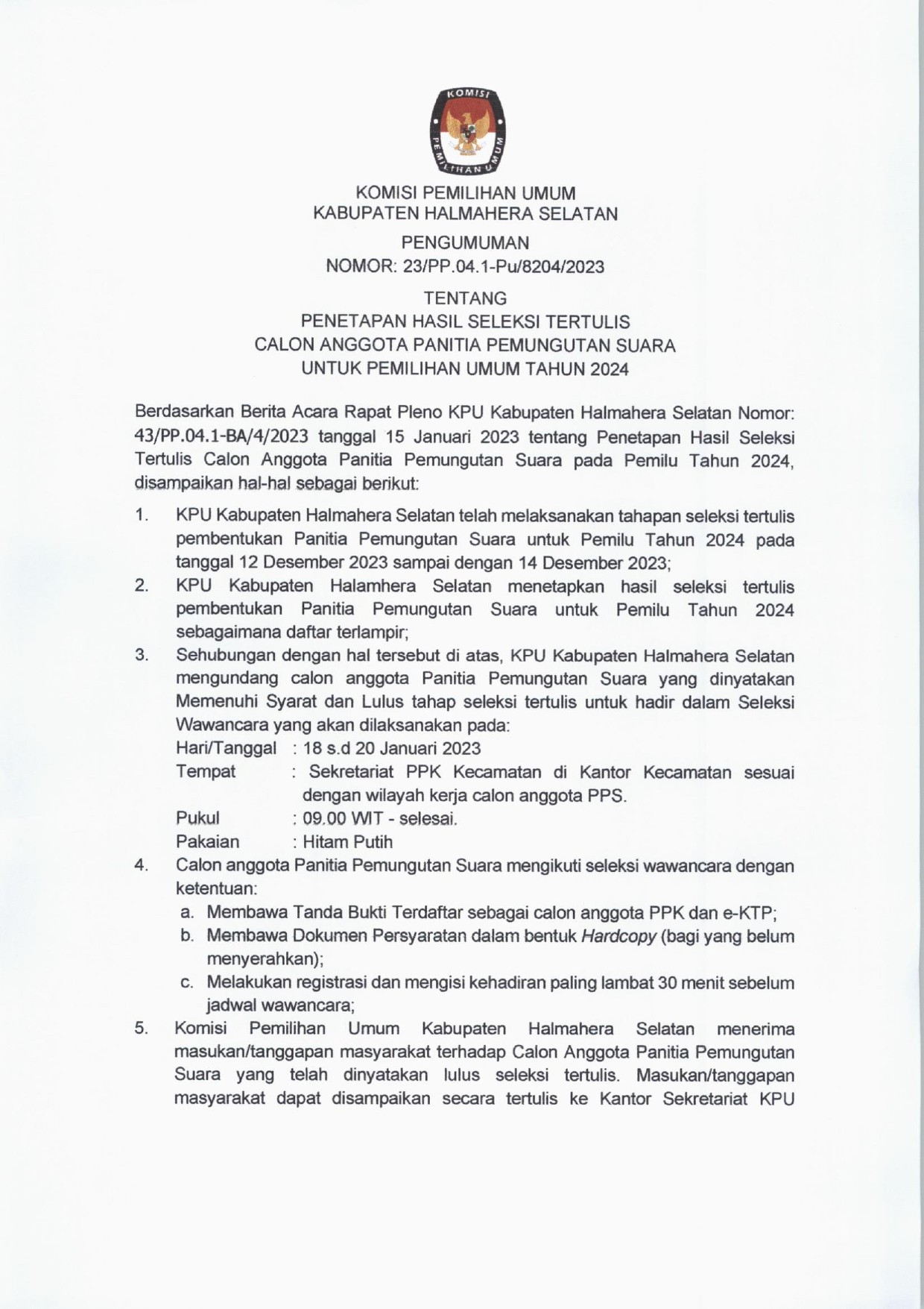 Pengumuman Penetapan Hasil Seleksi Wawancara Panitia Pemungutan Suara (PPS) Untuk Pemilihan Umum Tahun 2024 Minggu, 22 Januari 2023 23:00 148 Baca Selengkapnya