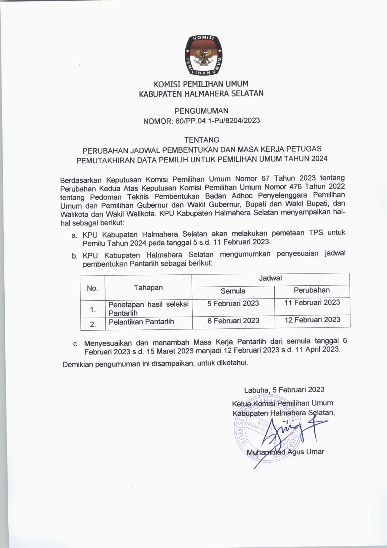 Pengumuman Perubahan Jadwal Pembentukan Masa Kerja Petugas Pemutakhiran Data Pemilih Untuk Pemilihan Umum Tahun 2024 Senin, 06 Februari 2023 14:00 69 Baca Selengkapnya