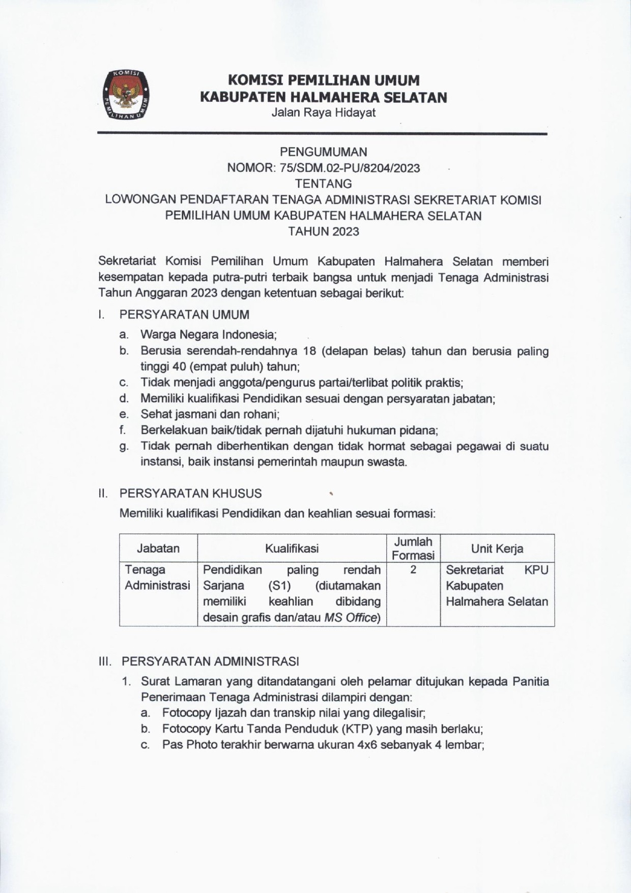 Pengumuman Lowongan Pendaftaran Tenaga Administrasi Sekretariat Komisi Pemilihan Umum Kabupaten Halmahera Selatan Tahun 2023 Kamis, 23 Februari 2023 19:40 152 Baca Selengkapnya