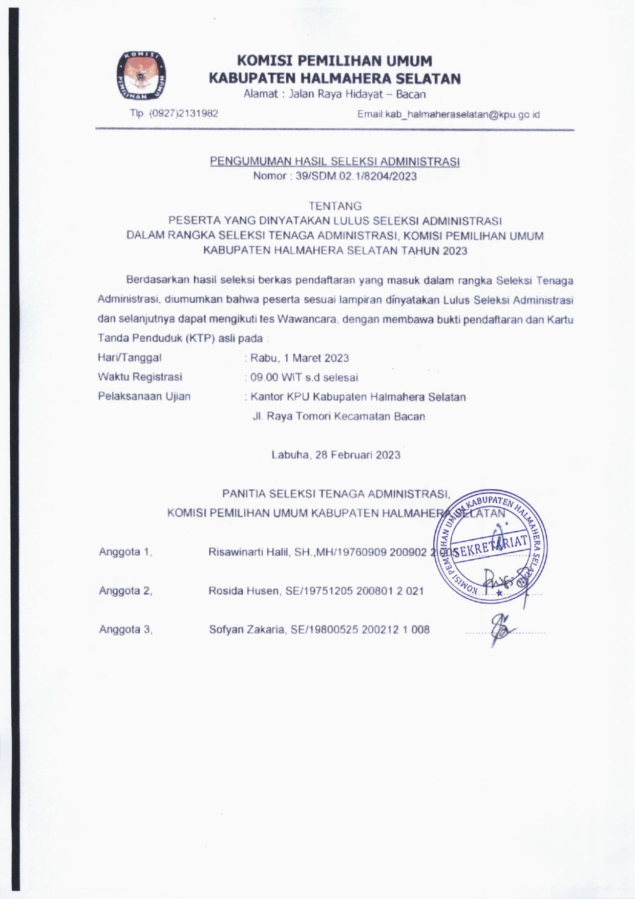 Pengumuman Hasil Seleksi Administrasi tentang Peserta Lulus Seleksi Administrasi, Tenaga Administrasi KPU Kabupaten Halmahera Selatan Tahun 2023 Dalam Rangka Seleksi Selasa, 28 Februari 2023 14:00 422 Baca Selengkapnya