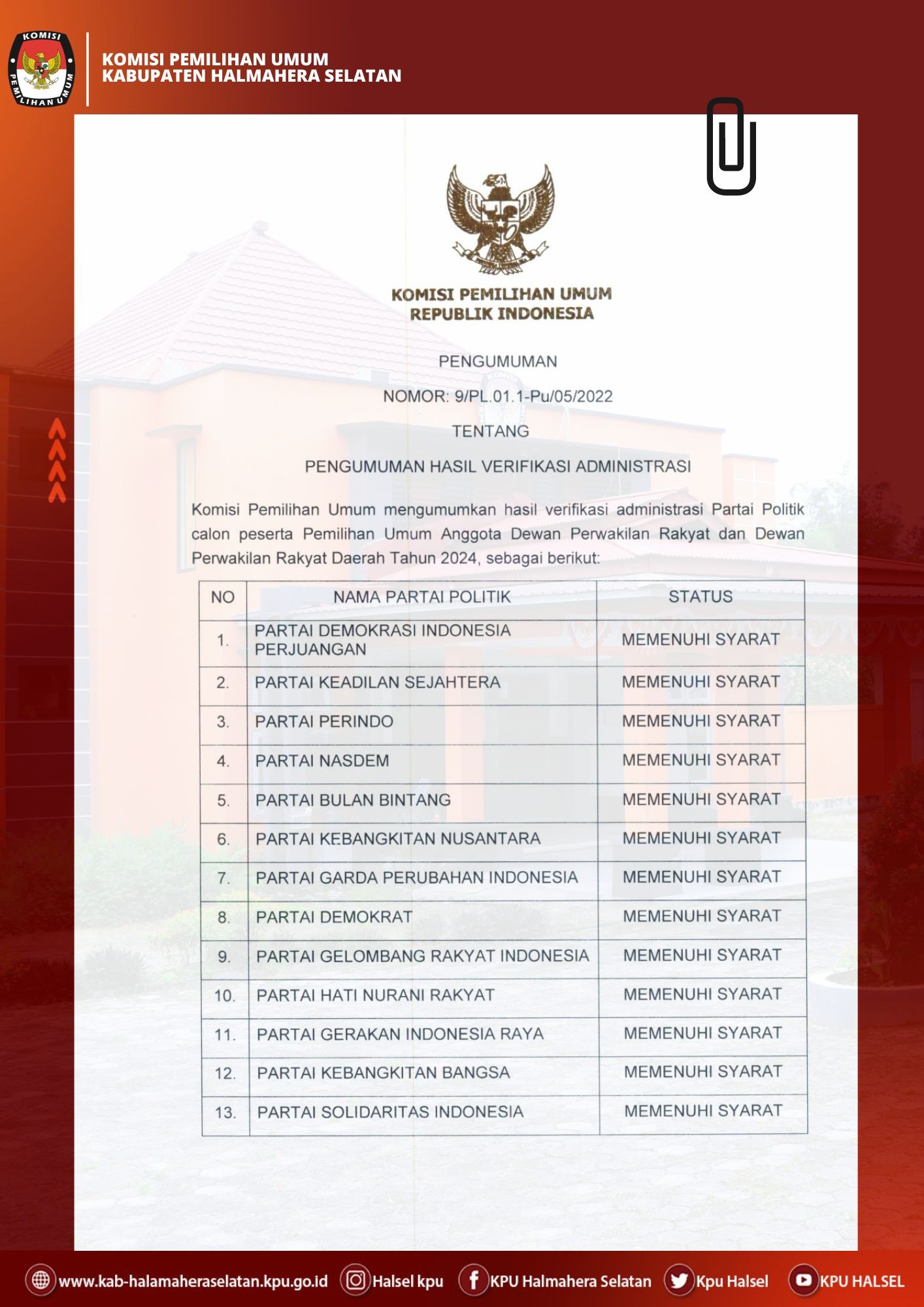 Pengumuman Hasil Verifikasi Administrasi Partai Politik Calon Peserta Pemilu Tahun 2024 Jumat, 14 Oktober 2022 18:00 116 Baca Selengkapnya
