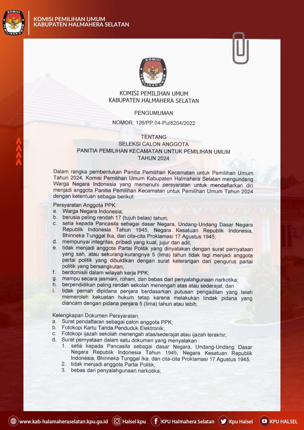 Pengumuman Tentang Seleksi Calon Anggota Panitia Pemilihan Kecamatan Untuk Pemilihan Umum Tahun 2024 Minggu, 20 November 2022 09:00 186 Baca Selengkapnya