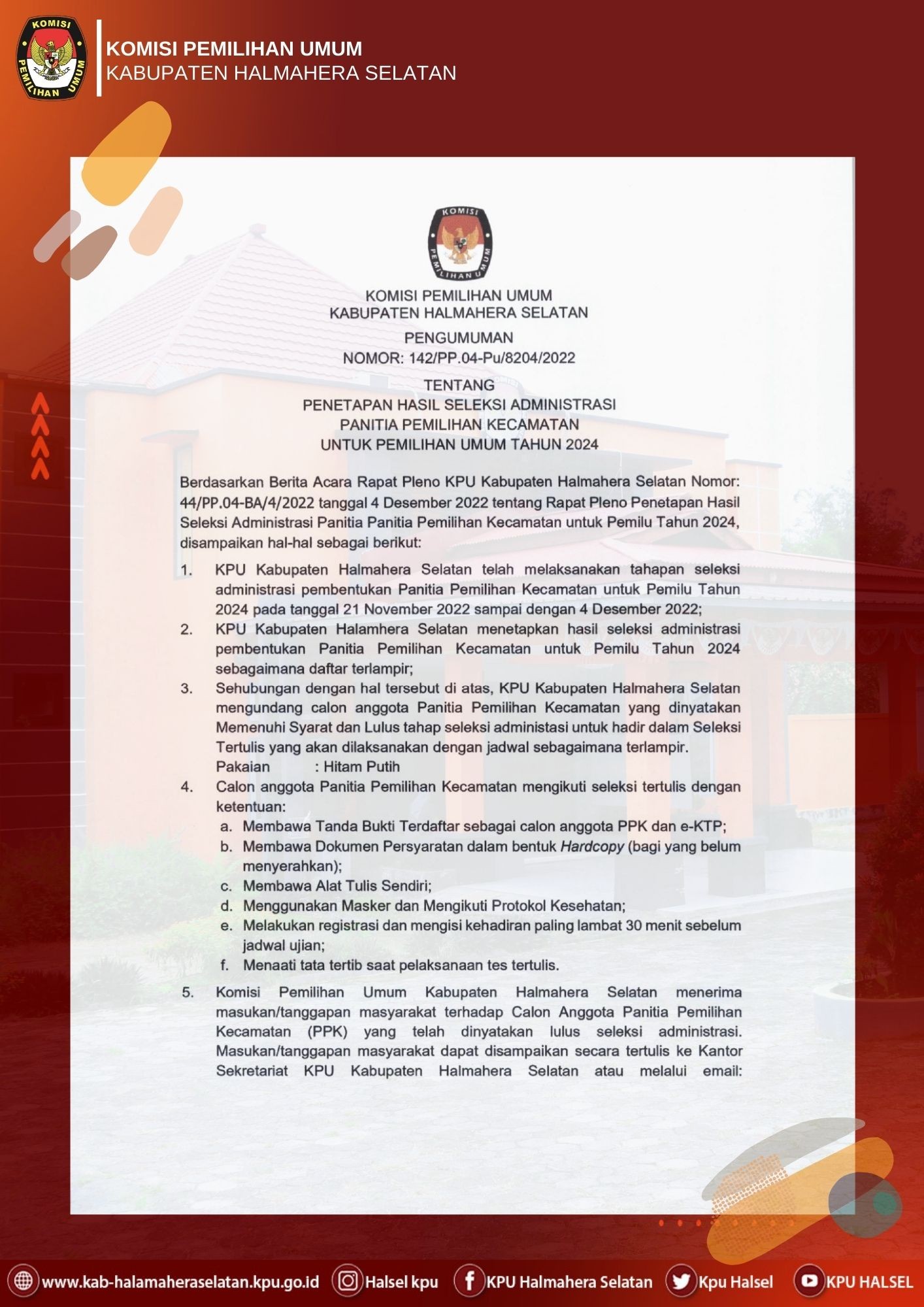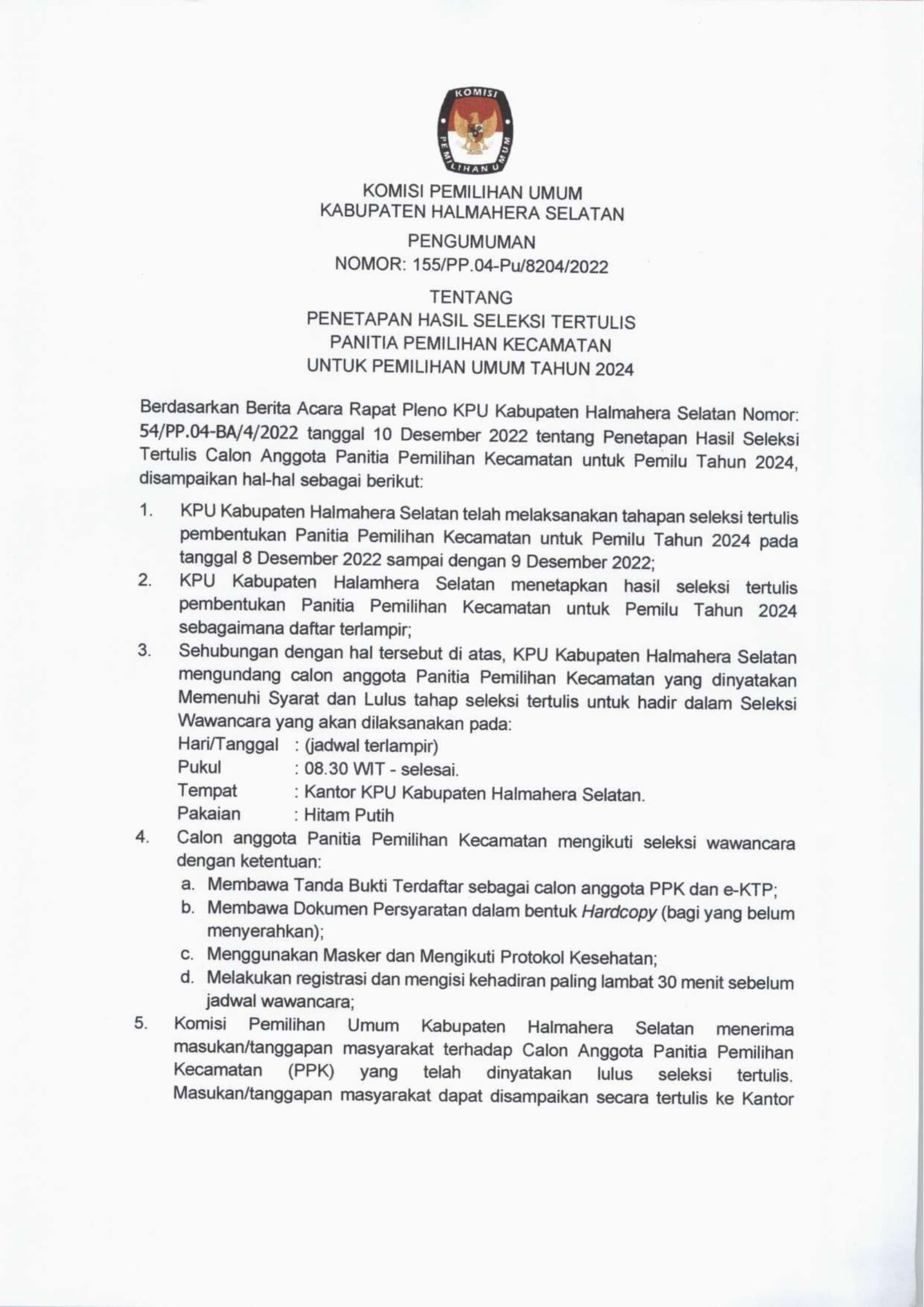 Pengumuman Hasil Seleksi Tertulis Panitia Pemilihan Kecamatan Untuk Pemilihan Umum Tahun 2024 Minggu, 11 Desember 2022 01:27 196 Baca Selengkapnya