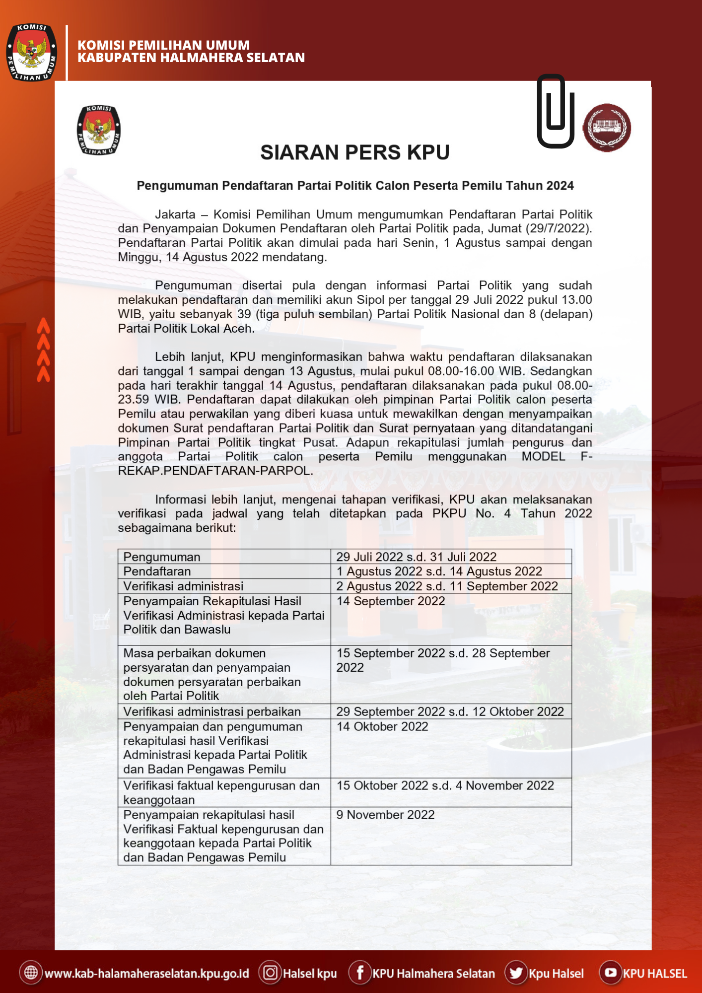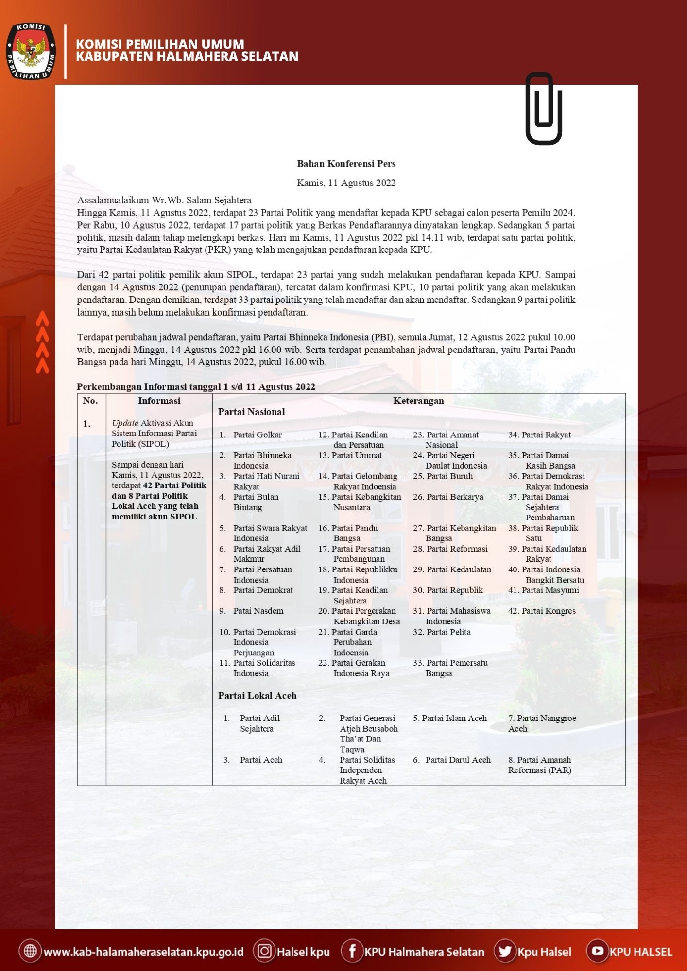 #TemanPemilih Berikut Konferensi Pers KPU Republik Indonesia terkait rekapan partai politik yang dokumen pendaftarannya telah dinyatakan lengkap, partai politik yang dokumen pendaftarannya belum lengkap serta jadwal pendaftaran, verifikasi dan penetapan partai politik calon peserta pemilu tahun 2024