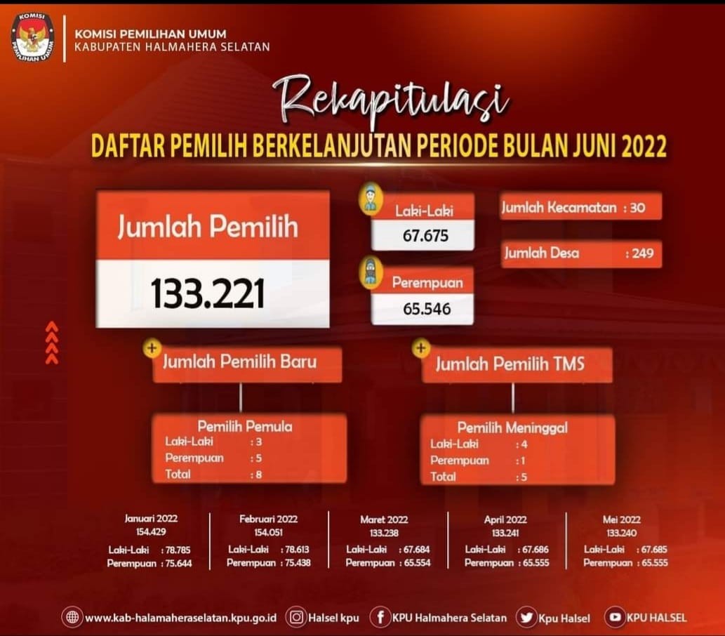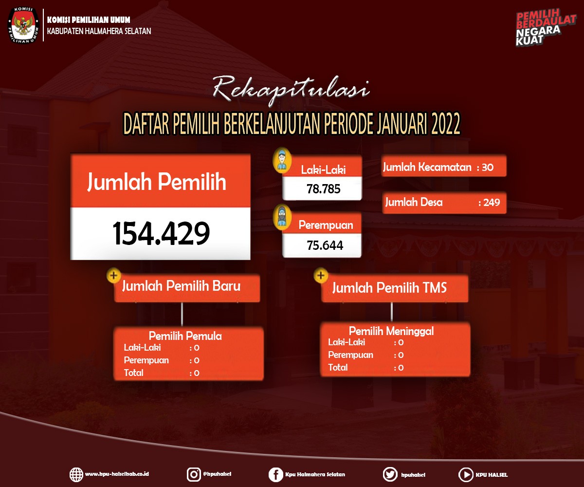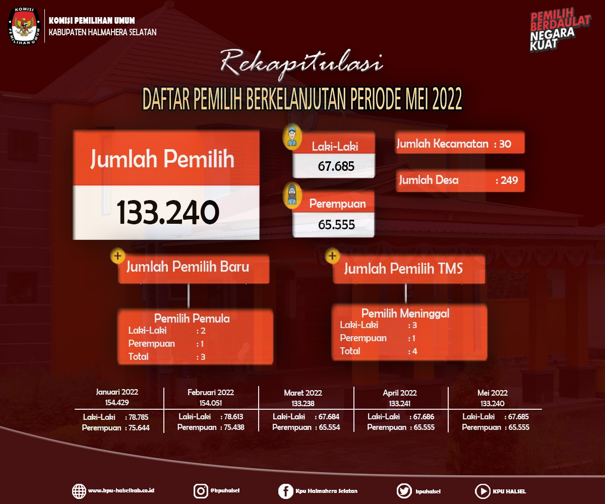 Pengumuman Rekapitulasi Pemutakhiran Data Pemilih Berkelanjutan (PDPB) Periode Bulan Mei Tahun 2022 Senin, 30 Mei 2022 20:22 369 Pengumuman Rekapitulasi Pemutakhiran Data Pemilih Berkelanjutan (PDPB) Periode Bulan Mei Tahun 2022 Baca Selengkapnya