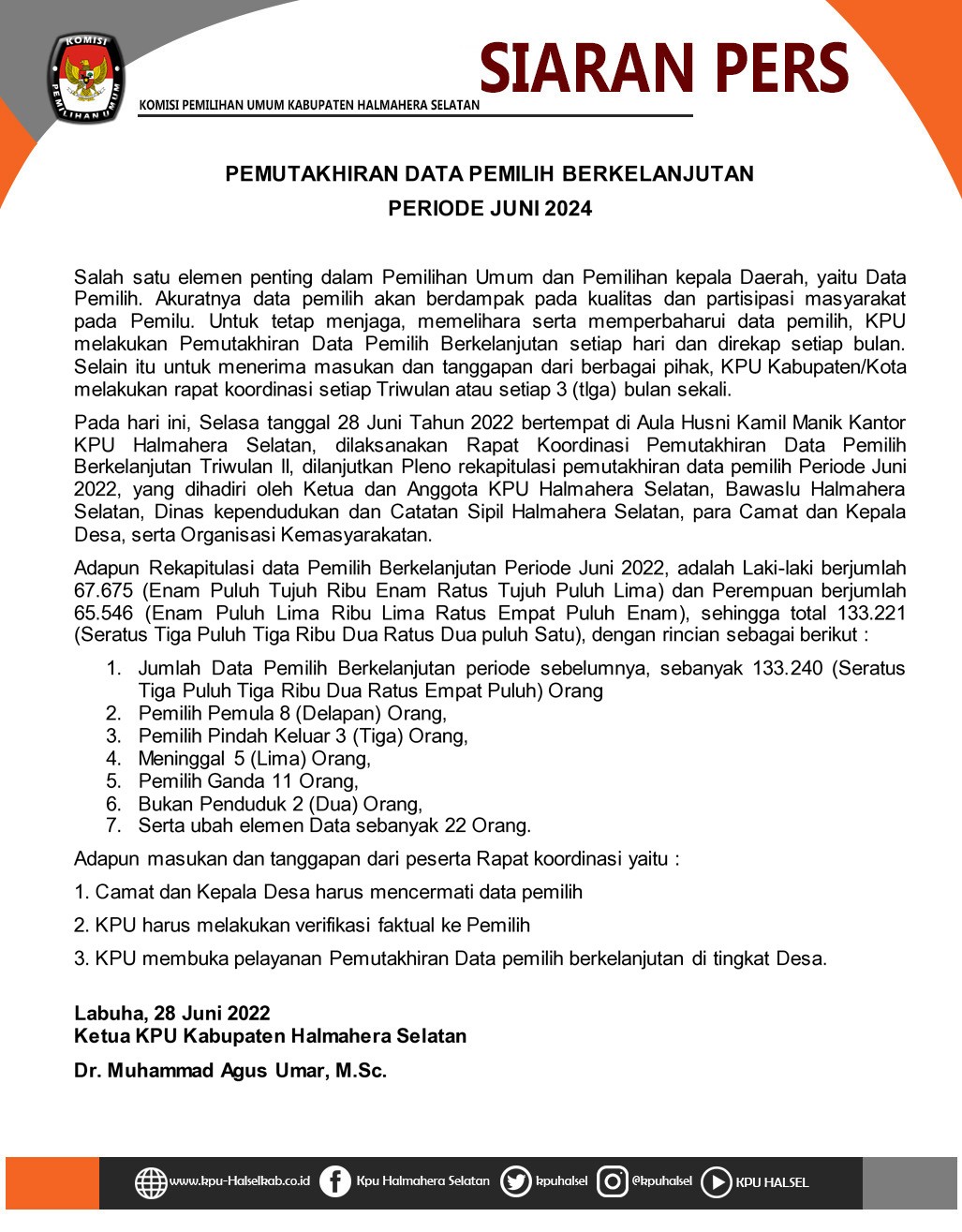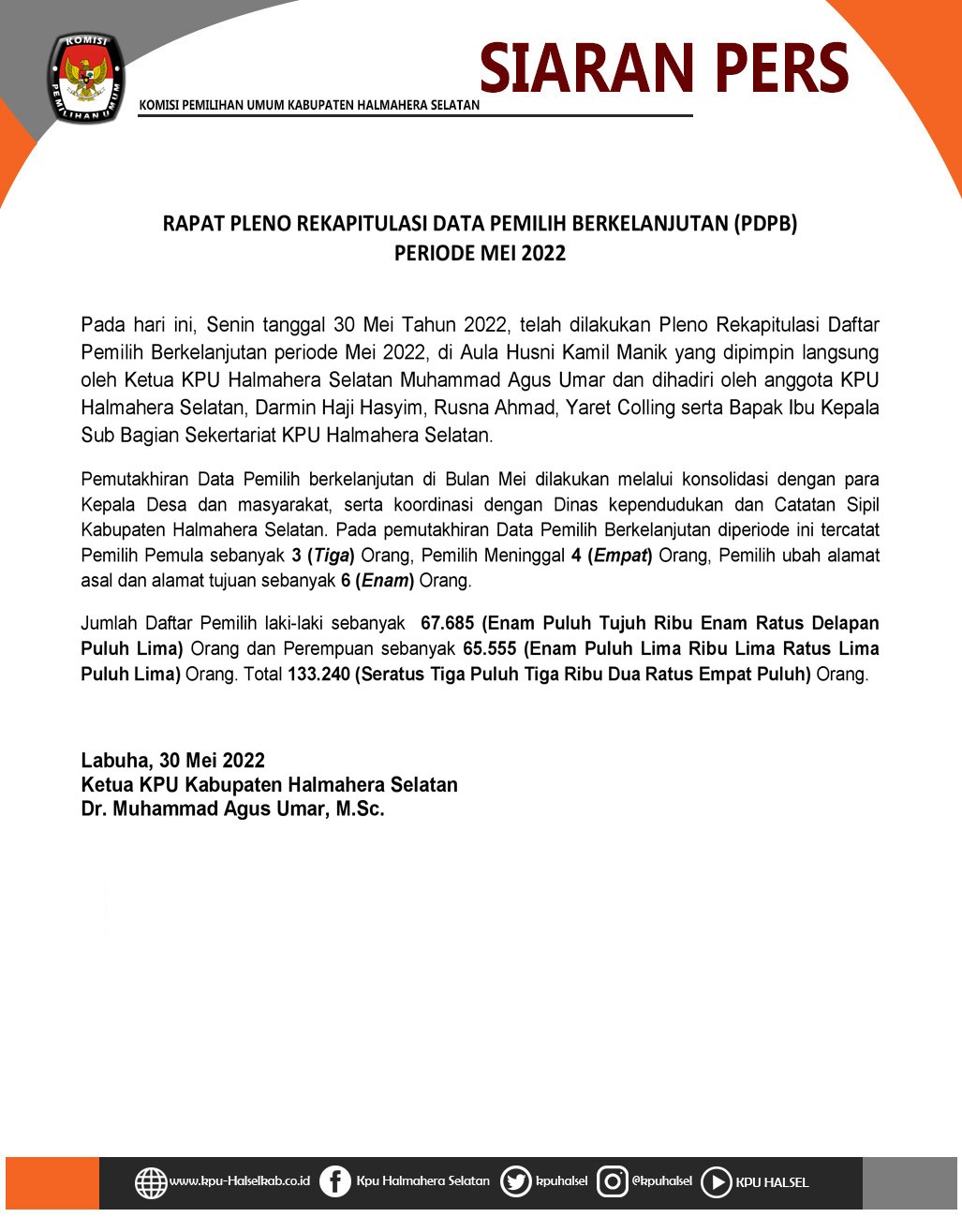 Siaran Pers Rapat Pleno Rekapitulasi Pemutakhiran Data Pemilih Berkelanjutan (PDPB) Periode Bulan Mei Tahun 2022 Senin, 30 Mei 2022 20:22 367 Siaran Pers Rapat Pleno Rekapitulasi Pemutakhiran Data Pemilih Berkelanjutan (PDPB) Periode Bulan Mei Tahun 2022 Baca Selengkapnya
