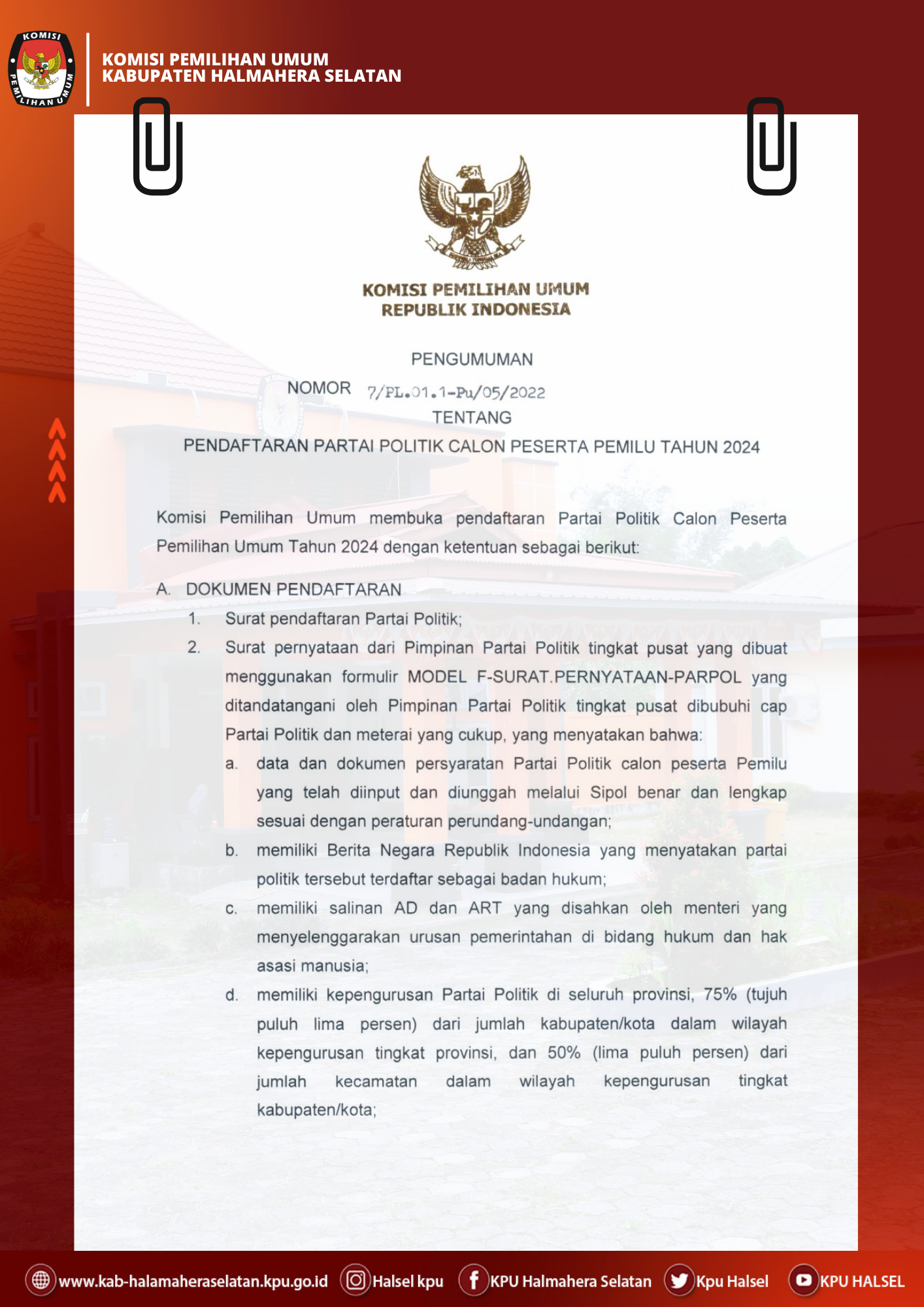 Pengumuman Pendaftaran Partai Politik Calon Peserta Pemilihan Umum Tahun 2024 Jumat, 29 Juli 2022 09:00 51 Baca Selengkapnya